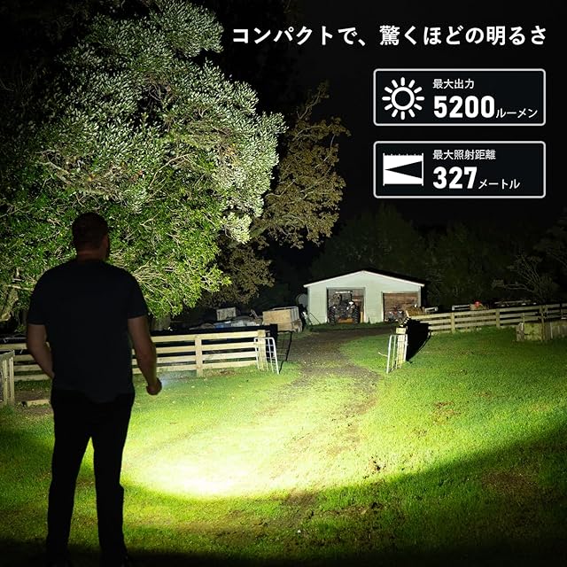 【高輝度】最大5200ルーメンの輝きで、夜でも昼のように照らします。327メートル先までの強力なビームが、暗闇でも確実な視界を確保します。そして、その強大な明るさを持ちながらも、非常にコンパクトなボディはポケットやバッグに楽々と収まるため、持ち運びも非常に便利です。