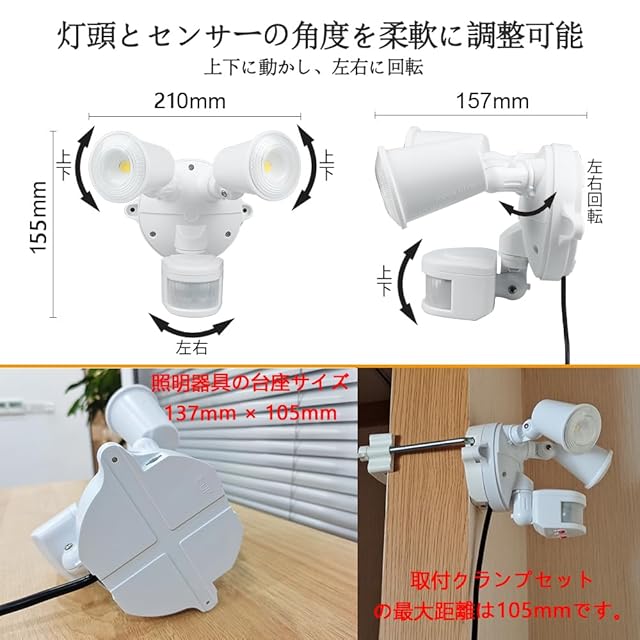【取り付け高さ】– LEDセンサーライトは1.8~2.2メートルの高さに設置するのがおすすめで、最適な取り付け高さは2メートルです。センサーは水平下向きに20°の検知範囲を持っています。ライトを2.5メートル以上の高さに設置すると、センサーの感度が低下する場合があります。