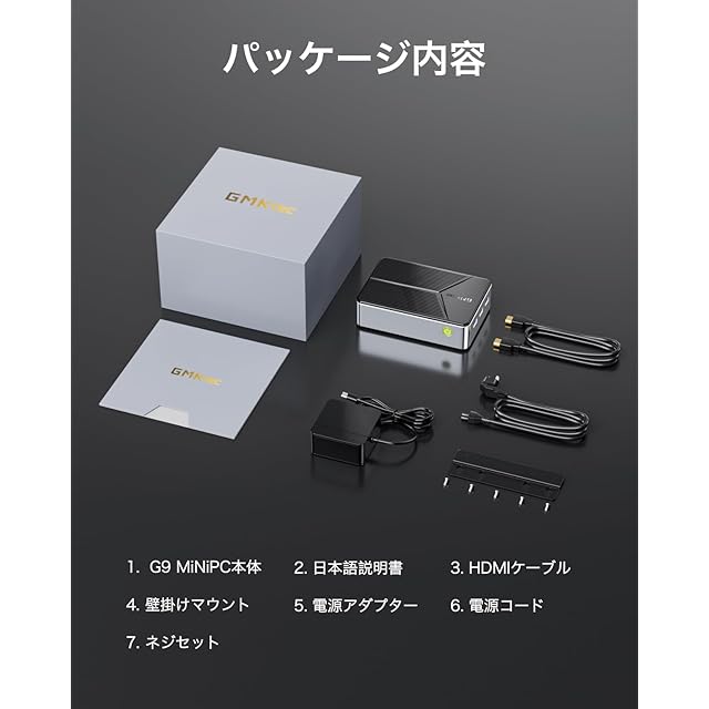 【PSE認証・品質保証】PSE(電気用品安全法)技術基準適合品でトラッキング対策適用範囲拡大対応です。GMKtecミニPCは厳格な品質テストを受けました。品質にはご安心ください。家庭/企業/教育/ライブ配信などどこでも適用します。それに一年の保証サービスを提供いたします、もし不具合があったら、ご遠慮なく連絡ください、弊社は誠に対応いたします。期間内は、通常通りご使用いただいて出た不具合に関しましては、修理もしくは交換しますのでご安心ください。【パッケージ内容】 パッケージ内容:GMKtec G9ミニPC本体(※本体には512GBのSSDが含まれています)×1 、ネジパッケージ×1、電源アダプター×1、HDMIケーブル×1、取扱説明書×1 、VESA ブラケット。