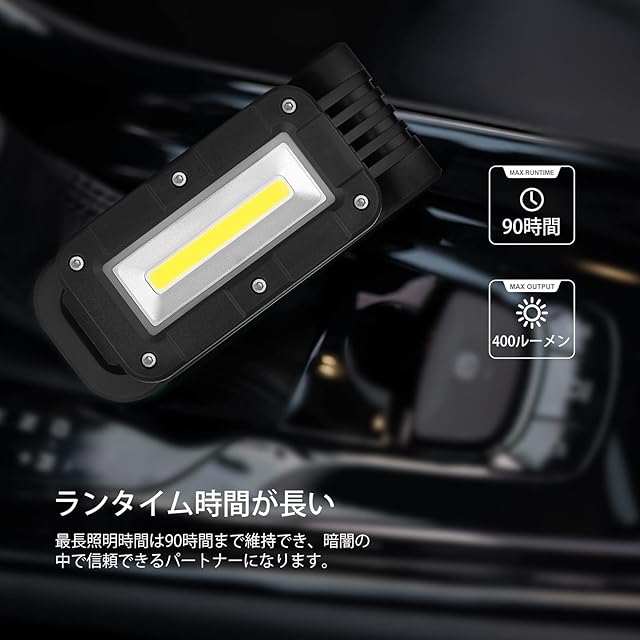 [マグネット&フック付き ] ワークライトの底部に磁石が付いており、スチール壁など作業場の金属表面や車体などに 取り付けて臨時照明することができます。また、フックもデザインされ、テントや服、ブランチなどに吊り下げられ、利便 性が高いです。更に、折り畳み式のコンパクトデザインで持ち運びや収納に便利です。180度回転設計で、多角 度照明を提供し、様々なニーズに対応できます