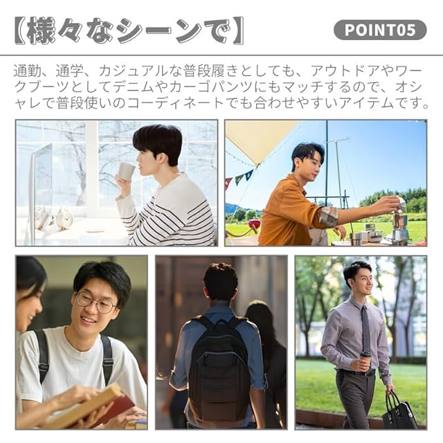 【様々なシーンで】クラシックな英国風デザインを取り入れ、洗練されたスタイリッシュな外観が特徴です。通勤、通学、カジュアルな普段履きとしても、アウトドアやワークブーツとしてデニムやカーゴパンツにもマッチするので、オシャレで普段使いのコーディネートでも合わせやすいアイテムです。