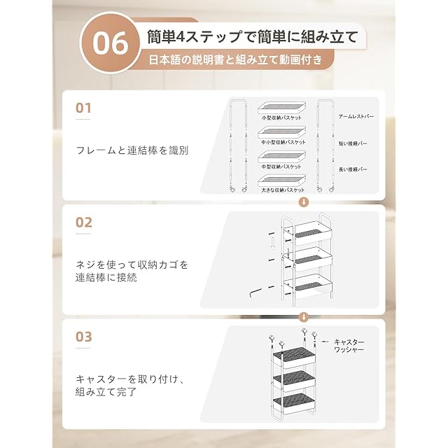【簡単組み立てと360度回転キャスター】この収納ラックは、組み立て式で初心者でも簡単に設置できます。付属の工具と日本語の組み立て説明書、ビデオチュートリアルが用意されており、手間なく完成させることが可能です。さらに、4つのキャスターのうち2つにはブレーキが付いており、360度自由に回転するため、移動が簡単で、必要な場所でしっかりと固定できます。キッチンやオフィスでの移動や掃除の際にも便利です。