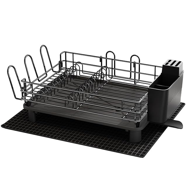 MAJALiS 水切りラック シンク上 食器ラック 水切りカゴ 台所 包丁スタンド 箸立て 吸水マット付き 自動排水 自然乾燥可能 組み立て簡単 1段式「ブラック」長さ40.3*幅30*高さ15.3CM
