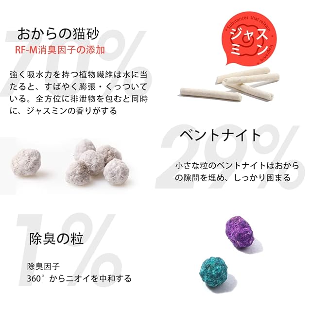 【複数の猫砂をMIX】 消臭力の高いおからに加えて、ベントナイトも加わることでさらにパワーアップ!大きさの異なる猫砂を配合することで隙間がなくなり、水分の吸収率が向上します。