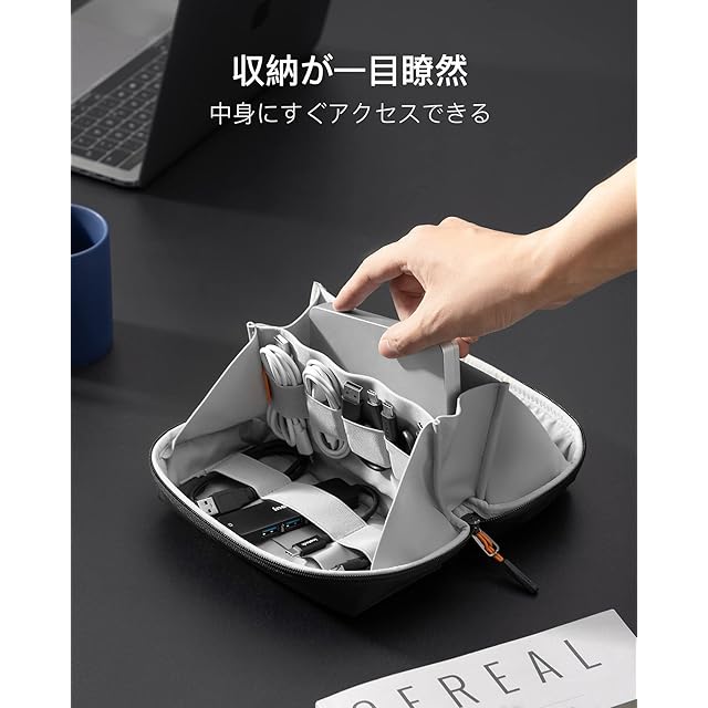 整然とした保管:充電器、ハードドライブ、モバイルバッテリー、マウス、イヤホン、USBケーブル、ノートブック、ゲームカード、ペンなどを保管すできる様々なサイズのコンパートメントまたはポケットが12個あります。物の大きさごとに分類を行うことで整然としているポーチを作ることができます。
