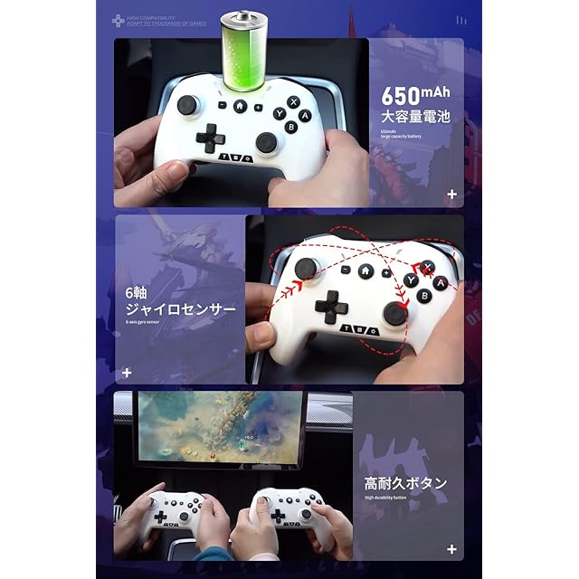 【3段階TURBO連射機能・低電圧警告】連射スピードは3段階調整可能で、何度も連打が必要なゲームには、特におすすめのゲームパッドです。また、650mAhのバッテリーを内蔵しております。Switchに電池残量を確認できるだけではなく、コントローラー本体も低電圧警告機能があります。電力が低いと指示ランプが点滅します。電量不足でゲーム体験を影響することを防げます。
