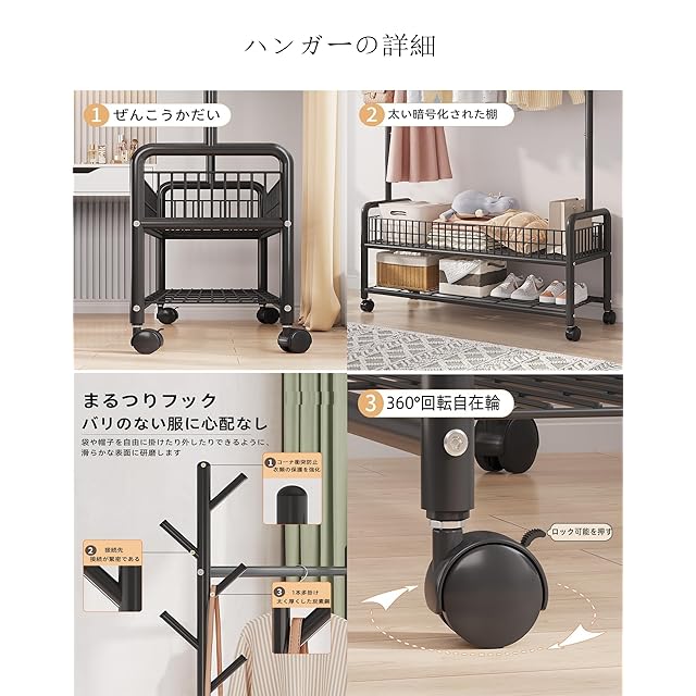 【多機能収納】多機能のハンガーラックはコートや洋服などをかける、帽子やカバンなどをかける、さらには収納ケース、靴、カバン、タオル、布団や小物を置くことも可能です。下部にある棚には靴やスーツケースも置けます。大幅にあなたの狭い部屋にスペースを省けます!