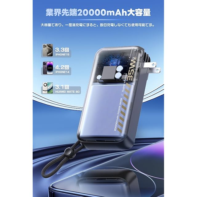 【業界初登場!35W超急速充電&20000mA大容量モバイルバッテリー】実用性の高さから、一番人気を誇る35W急速充電モバイルバッテリー待望の新作が初登場!最大35W出力に対応したケーブルはあらゆるデバイスを充電可能な画期的なモバイルバッテリーです。30分でiPhone X-15モデルへ60%給電可能。短時間で携帯電話の電力を回復させることができます。軽量ながら20000mAhの大容量を実現、パワフルかつポータブルで通勤通学の外出時や出張の際にはもちろん、停電の際や災害時に活用できる防災用途のバックアップ電源として幅広いシーンでご利用いただけます。