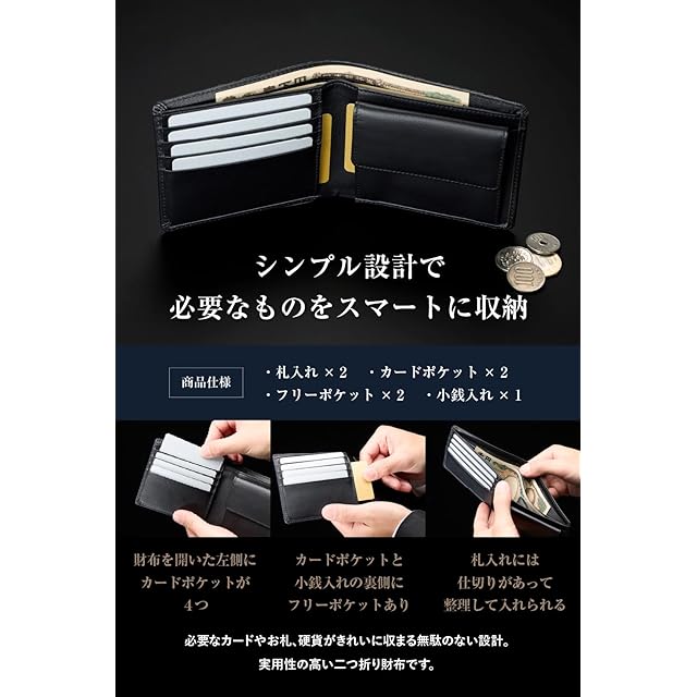 【シンプル設計で必要なものをスマートに収納】マチが大きく開いて出し入れしやすいコインポケット。一目で中身が分かり、小銭の出し入れがしやすいです。財布を開いた左側にカードポケットが4つあり、カードポケットと小銭入れの裏側にフリーポケットが1つずつあり、カードもたくさん収納可能。札入れには仕切りがあって、お札や領収書などを整理して入れられます。必要なカードやお札、硬貨がきれいに収まる無駄のない設計。実用性の高い二つ折り財布です。