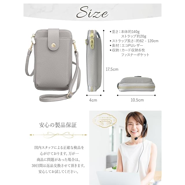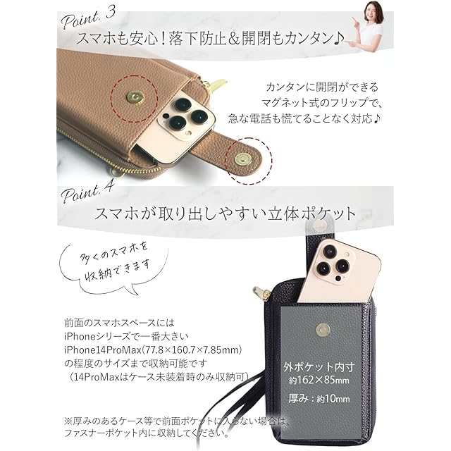 ✅✅✅✅【大きめのスマホも入ります。】スマホ用全面ポケットのサイズは約162×85×10mmで、iPhone14ProMax(77.8×160.7×7.85mm)も収納可能です。本体サイズは長さ175×幅105×奥行40㎜、重さは本体で140g、ストラップ長さは62-120cmで調整が可能です