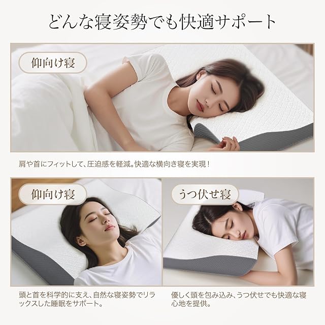 【どんな寝姿勢にもフィット|仰向け・横向き・うつ伏せ寝にも対応】仰向け寝では頭部を優しく支え、首の自然なカーブをキープ。横向き寝では肩への圧迫を軽減し、心地よくフィット。うつ伏せ寝でも快適に使えるよう設計された多機能枕です。肩こりや首の違和感でお悩みの方にもおすすめの健康枕。毎晩ぐっすり眠れる極上の寝心地をお届けします。