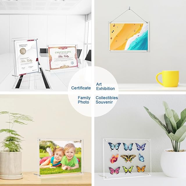 【簡単な交換と組み立て】到着後保護膜を剥がしてください、2枚のアクリル板にスネジを付けるだけで完了です。A3サイズの画像や賞状用紙の差し替えも簡単です、縦置きか横置き、フレームを支えてる支柱の位置を変えると置き方が変えられます。ワイヤーをフレームに装着すると壁に掛ける事が出来ます。