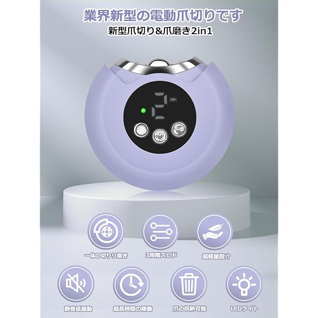 【3段階速度調節&高い安全性】この電動爪切りは、2段階の調速機能を備えており、個々のニーズに合わせて調整することができます。赤ちゃんの柔らかい爪は低速モード、大人や高齢者の硬い爪は高速モードで用途によって使い分けてお使いください。(また、この電動爪削りは安全ロック設計を採用しているので、子供が誤傷する心配もありません。)注意:爪削りを開くには、2つのボタンを同時に長押しする必要があり、爪切りが30秒静止すると自動的に閉じます、再びスイッチを押すと、使用を続けることができます。
