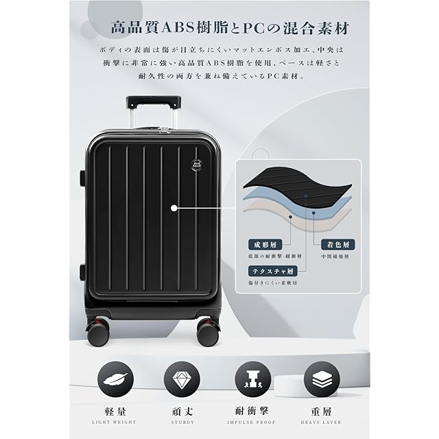 【2024新登場・フロントオープンデザイン】立てたまま荷物の出し入れができる便利なフロントオープンスーツケースです。15.6 inchまでのPC、タブレット、書籍、携帯電話、チケットなど、荷物に合わせた細かなポケットを用意しており、フロントポケット内の荷物の仕分けもラクラク。急な荷物の出し入れ時に本体を開けずに前面のフロントポケットを開けるだけで簡単に荷物が取り出せます。
