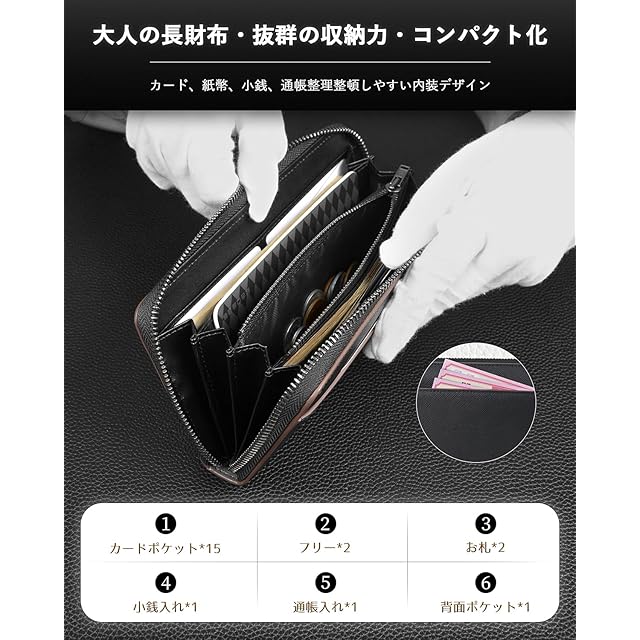【大容量で使いやすさ抜群】ファスナの長財布で蛇腹に全開するので、中が一目瞭然。お札を分けたり、レシートを分けたりと細かく収納することができます。カード入れは片側6枚づつ収納可能で、隠しカードポケットが3つあり、合計15枚のカードが収納できます。小銭入れの横側には通帳入れが1箇所あり、カードいれの側にお札入れが2箇所あり、カード入れの背面にはそれぞれフリーポケットを備えています。紙幣、硬貨、カードの収納に加えて、レシートや関連書類も別の仕切りに分けて整理して財布に収納できます。更にファスナーで全開するので、あるといいなが沢山詰まったシンプルなファスナー長財布です。