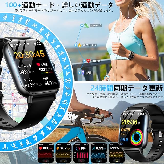 100+運動モード・詳しい運動データ:このスポーツウォッチは屋外屋内のランニング、バスケットボール、サイクリング、野球、ヨガ、縄跳び、バドミントン、テニスなど100種類以上の運動モードが搭載されています、日常のトレーニングに完全に満足できます。