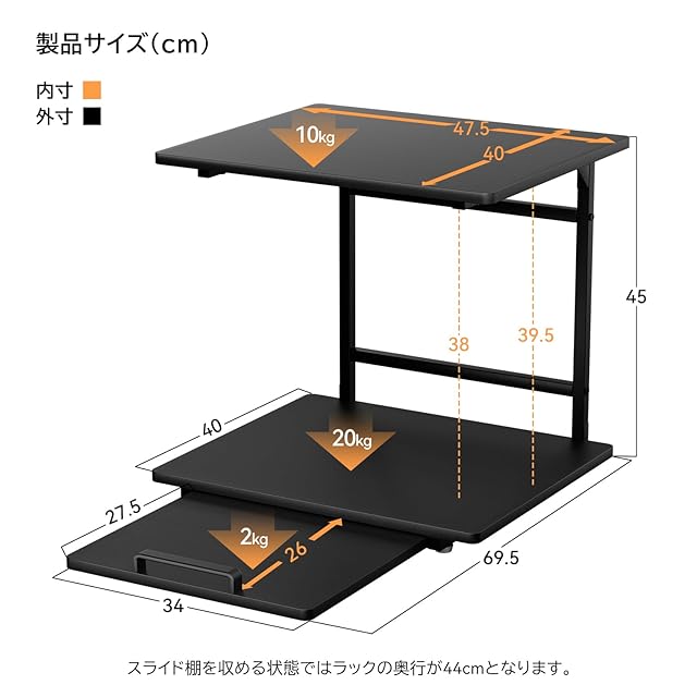 【商品仕様】商品サイズ:幅47.5×奥行43.5-69.5×高さ45cm、棚板サイズ:幅47.5×奥行40cm。各層棚耐荷重:上段棚板:約10kg、下段棚板:約20kg、スライド棚板:約2kg。ラックの幅は47.5cmなので、市販のほとんどの小型冷蔵庫に対応できます。