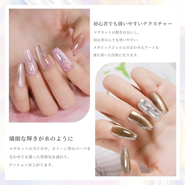 【マグネットの動きは良い】マグネットの動きは良いし、初心者の人でも使いやすい。メタリックジェルとの合わせるアートも落ち着いた印象になります。 異なるベースカラーと組み合せるアートもokです。