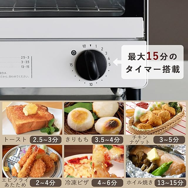 【食材に合わせた調理時間】最大15分まで設定できるタイマー機能搭載。食パンはもちろん、とろーりチーズのピザにこんがりお餅、グラタンなど食材に合わせてお好みで設定してください。
