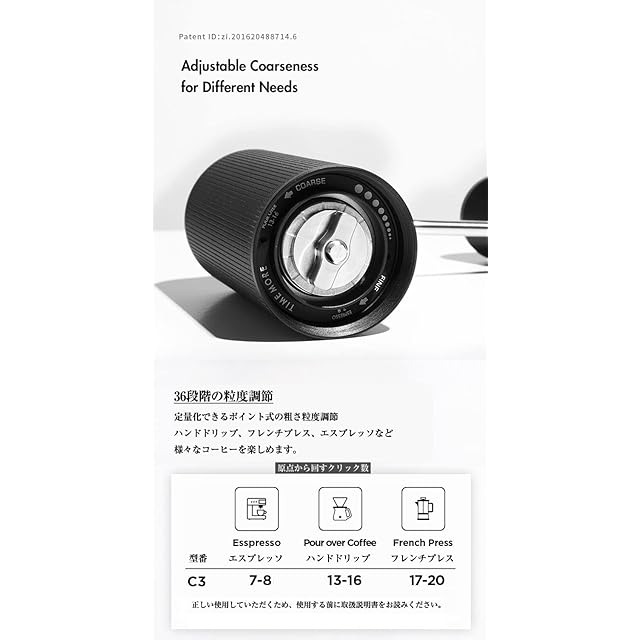 4.【調節機能】約36階段で調整できます。調節ナットで細挽きから粗挽きまで簡単にお好みの粗さで挽いていただけます。ハンドドリップ 、フレンチプレス、エスプレッソなど様々なコーヒーを楽しめます。