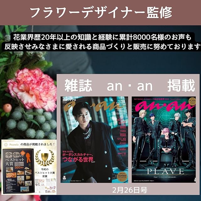 【フラワーデザイナー監修】(商標登録番号:6641739)生花・造花を含め花業界歴20年以上のデザイナーが累計7000人からいただいたお声をもとに細部にまでこだわった商品を販売させていただいております。受け取った方が幸せな気持ちになりますように・・・と願いを込めて作りました。※類似品にはご注意ください。