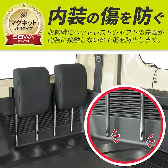 セイワ(SEIWA) 車種専用用品 スズキ ジムニー & シエラ(JB64 / JB74)専用 マグネットヘッドレストホルダー 2個入 IMP298 マグネット取り付け マグネット収納 ヘッドレスト ホルダー 後部座席/運転席/助手席のヘッドレストを収納可能 収納 工具不要 車中泊 アウトドア フルフラット ラゲッジ 荷室