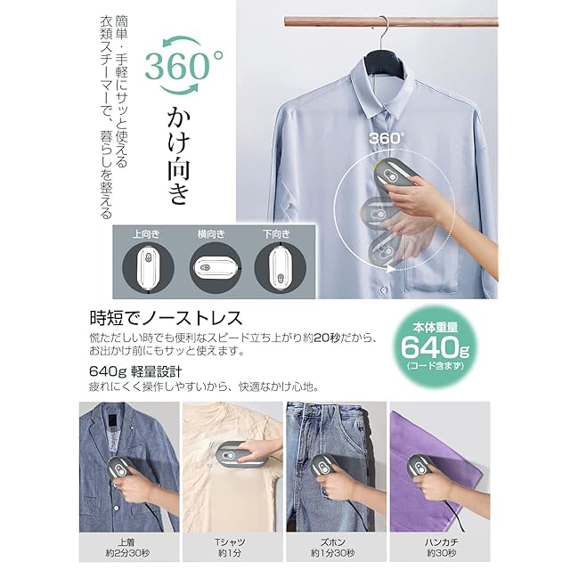 【超強力·長持続力スチーム&20秒素早く立ち上がり】衣類スチーマーの噴射する蒸気は22g/分としっかりシワを落とすスチーム量、9孔のスチームが広範囲に多く展開されることに加え、噴出できるスチームの範囲が広がり、シワ伸ばしの時間を短縮できるし、衣類全体をムラなくキレイにシワ伸ばしできながら、ハイパワースチームで除菌*消臭、衣類についた花粉やアレル物質の軽減にも役立ちます。 「軽量」本体が640gだけ、手元の負担を軽減する手元重心設計のため、片手で持っても楽にアイロンかけます。専用スタンドが付き、置き場所に困りません。
