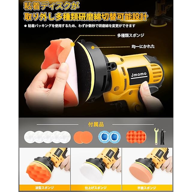 Jmomo ポリッシャー 電動ポリッシャー 車 125mm 二十段変速可能 強力モーター 研磨機 サンダポリシャー 軽量 車磨き ワックス作業 塗装面用 家庭用 艶出し 傷消し 研磨パッド付き スポンジセット付き (イエロー)