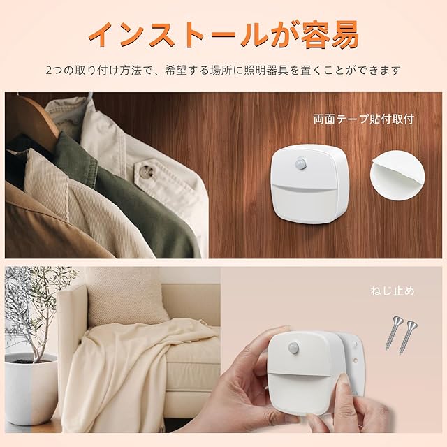 ✨【取付けカンタン】センサーライト 電池式 クローゼットは乾電池式で電源や配線が不要なので、コンセントのないいろんな場所でも幅広くお使いいただけ、場所を自動に明るく照らします。また、強力な両面テープもしくはネジでどこでも簡単に取り付けられており、勝手に落下しません。しかも、じんかんせんさー ライト 室内はスマートなデザインなのでお部屋のインテリアの雰囲気も壊しません。