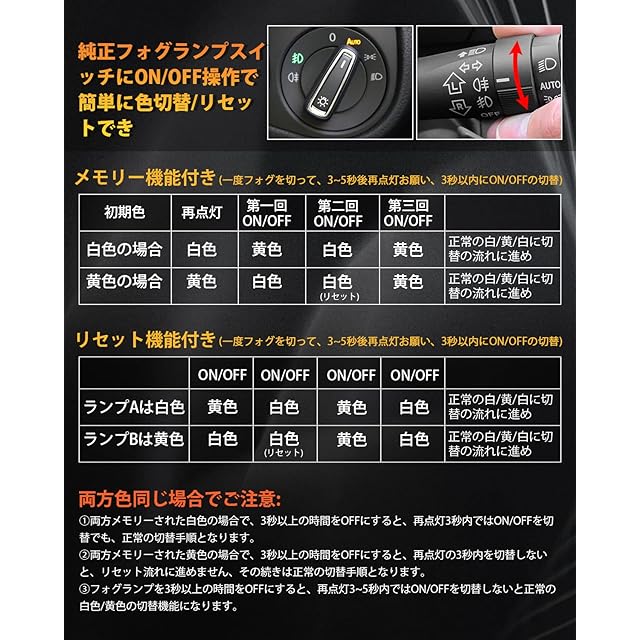【メモリー機能付き】両方色違いの場合があって、どうしてもリセットをできません?毎回毎回エンジンをスタート時にランプの色を切替が面倒?コントローラー付きタイプの取付は自分でできません、専門業者に頼まないといけません?BORDAN h8 ledフォグ は2色切替できるのうえ、メモリー機能を付いて、毎回面倒な切替要らず、スタート時はデフォルトは前回使用色であります。そして、業界初の一体型メモリー機能付きフォグランプで、取付はすごく簡単、女性でも自分でできます。色違いの心配でも要らず、リセットの操作流れはスイッチのON/OFFを切替だけで完成できます。