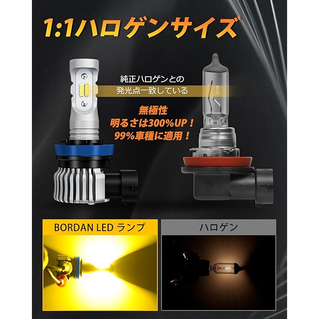 【2023爆光モデル 】夜道暗くて、運転危なかった?カッドラインは出てず、車検通らなかった?サイズが合わない、取り付けできなかった?BORDAN h8 led フォグは従来品より、明るさ300%アップします。スイッチを繰り返すだけでホワイトとイエローに切り替えます。6000kのホワイトは晴れや曇りの日に最適、3000kのイエローは雨や雪の日に適してます。 天候や気分に応じて簡単に色味を変更できる!高品質のCSP1860チップを採用しています、一つのバルブ合計16SMDで、ハロゲンより大幅に視認性を高めています。夜間の走行が非常に楽になり、安全に運転しています!