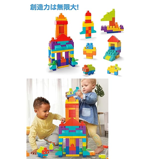 【内容】1~3才のお子さま向けに特化して開発された、メガサイズのブロックたっぷり150個セット、特殊パーツ入り。適度な固さの特別に大きなサイズのブロックは、小さなお子さまでも重ねたり、はずしやすい設計。ストレスなく夢中になって遊べます。さらに、葉っぱや、動物の目、タイヤといった特殊パーツは、お子さまの想像力を刺激し、自由な発想を育てます。パッケージは、大容量の繰り返し使えるチャック付きのバッグで、持ち運びもお片付けもラクラクです。2023 MEGA Brands.