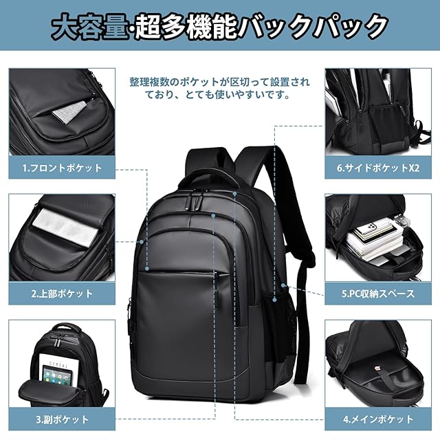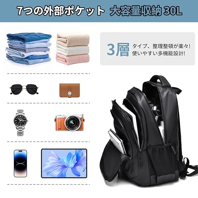 【3層タイプ多機能&7つのポケット】3層タイプ リュック で、整理複数のポケットが区切って設置されており、ポケットも沢山あって機能性で、とても使いやすいです。リュック メンズ 全て7つのポケットは、A4サイズファイル、15.6インチPC、iPad、教科書、ペン、傘、衣類、飲み物、お弁当など全て一気に収納できます。バックパック のメインポケットには独立したパソコンポケットがあり、15.6インチのノートパソコンを完全に収納できます。2つのサイドポケットはコップと折りたたみ傘を収納できます。