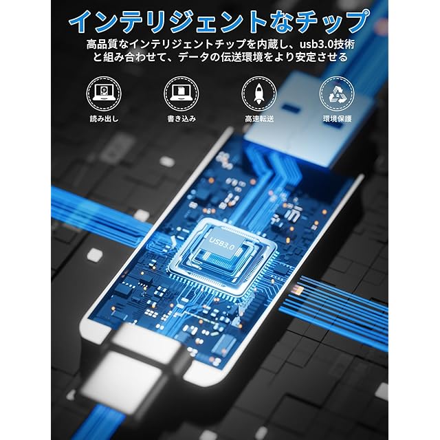 【先端なUSB3.0、高速データ転送】本USBメモリは先端的なUSB3.0を採用して、内蔵のインテリジェントなチープを組み合わせて、データの転送速度はUSB2.0の10倍以上高速です。また、USB 2.0との下位互換性があり,高速なデータ転送を実現、大容量のデータや写真・ビデオも短時間で転送可能です。「ご注意:通常、機器の種類とファイルの種類は実際の使用速度に影響を与えることができますが」