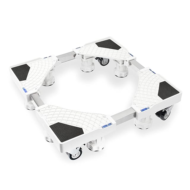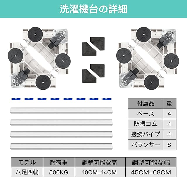 Airblue 洗濯機 台 キャスター 8足4輪 洗濯機置き台 防水パン 適格請求書発行可 冷蔵庫置き台 洗濯パン 防振パッド付き 360度回転 長さ調節可能 高さ調節可能 対応移動式 昇降可能 騒音対策 減音効果 耐荷重500KG (ホワイト)