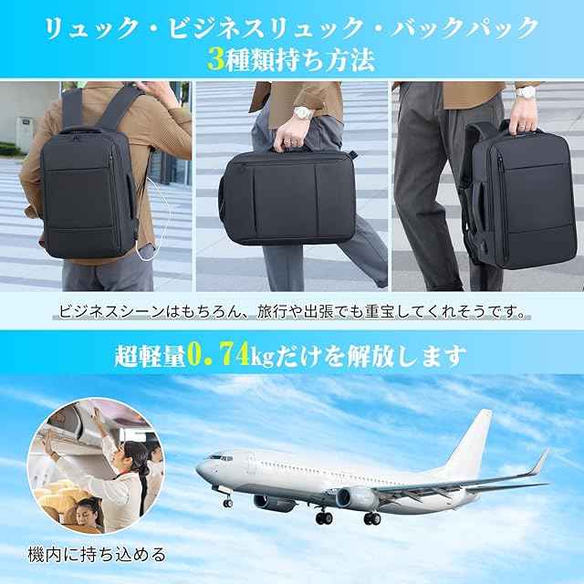 【コンパクトながら持ち運び便利リュック】ビジネスリュック サイズ:42×30×15cm 重量:わずか0.74kg 心配のない超軽量タイプです。 驚きの収納力と使いやすさを兼ね備えた人気のバックパックです。 飛行機での持ち運びが可能です。 荷物が多い時や出張時にも使える3WAYバッグです。 また、スーツケースなどに掛けられる専用機内持ち込み機能も搭載しており、旅行にもご使用いただけます。 大小のポケットがたくさんあるので、仕分けや取り出しが簡単です。