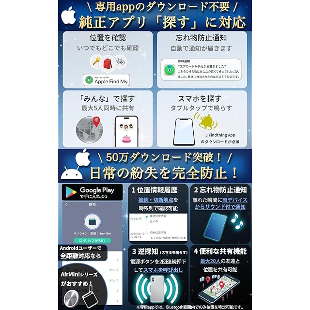 【業界初のAndroid対応】アンドロイドの全機種に対応し、iPhoneの「探す」以上の追加機能も使用可能。(置き忘れ防止通知・位置情報履歴・逆探知機能(製品からスマホを呼び出す)・最大20人の共有機能)