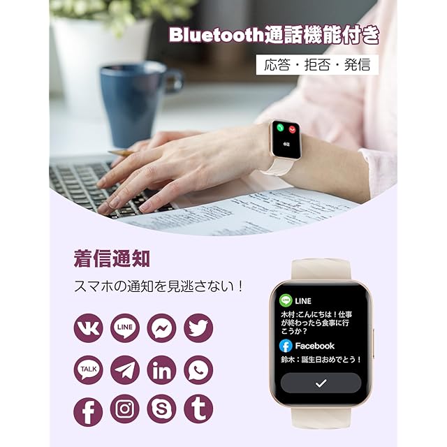 【大容量バッテリー&便利な機能満載】長い持ちのバッテリー搭載され、一回フル充電、3~5日間の連続使用も問題なく、待機時間は約30日間です。頻繁に充電する手間が省けます。付属の磁気充電ケーブルをスマートウォッチの充電端子に接続すると充電開始となります(実際の使用状況や環境によって電量持ち時間が異なります)通知やBluebooth通話などの基本的なスマートウォッチ機能に加え、例えば、音声アシスタント、おやすみモード、携帯検索、天気予報、懐中電灯、電卓、ゲーム、目覚まし時計、ストップウォッチ、SOSなど、日常生活をより快適にする機能が搭載されています。また遠隔操作もお任せください。ios9.0以上、android5.0以上のスマホに対応可能、さまざまシーンで使用できます!レディースでも、メンズでも、幅広い方にお使いいただけます。敬老の日、誕生日、父の日、母の日、新年、 クリスマスなどに適用なプレゼントとなります。