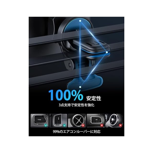 【安定したベント式固定】強力なベントクリップと固定アームにより、取り付けの安定性が向上。