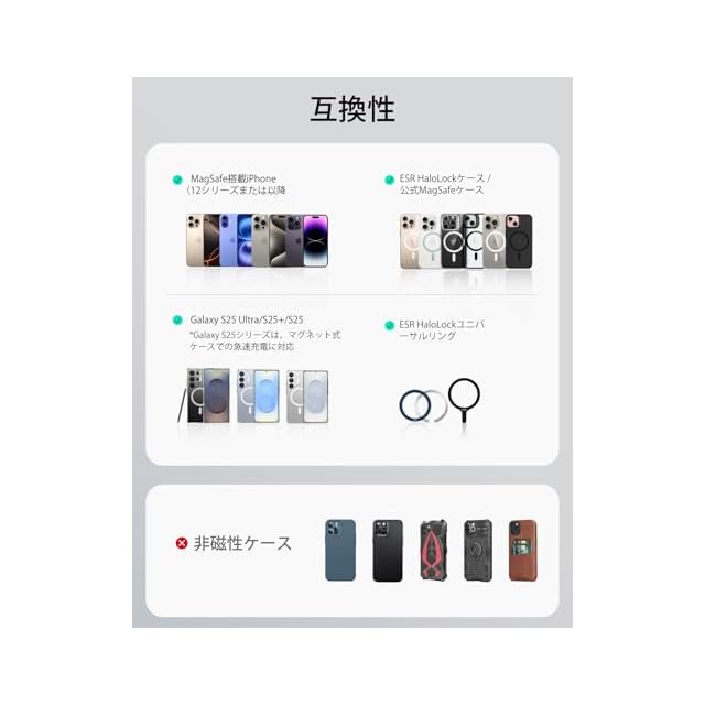 【互換性】:iPhone 16/15/14/13/12シリーズ、Galaxy S25 Ultra/S25 +/S25 マグネットケースのみ対応。