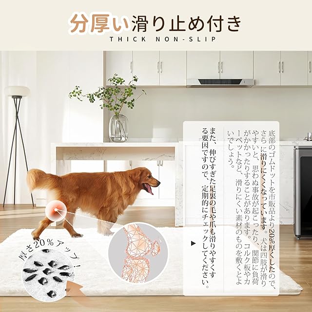 【滑り止め20%アップラグ】お子様や高齢者、ペットのいるご家庭の安全を確保するために、特別にゴムドットの厚みを強化しました。これにより、高齢者がカーペットの上を歩く際に滑る心配をせずに安心して歩けるようになり、お子様が遊ぶ際もより安全に走り回ることができます。また、犬が膝蓋骨脱臼を起こして動物病院に行く回数も減らすことができます。