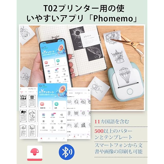 サーマルプリンター Memoqueen T02 スマホ対応 ミニプリンター モバイルプリンター 感熱プリンター ラベルライター メモプリンター コンパクトプリンター フォトプリンター Bluetooth接続 はがき/写真アルバム/手帳/メモ/買い物リスト/学習ノートに使用することができます 専用アプリアプリ 本体にはロール状感熱紙サンプルが付属してい