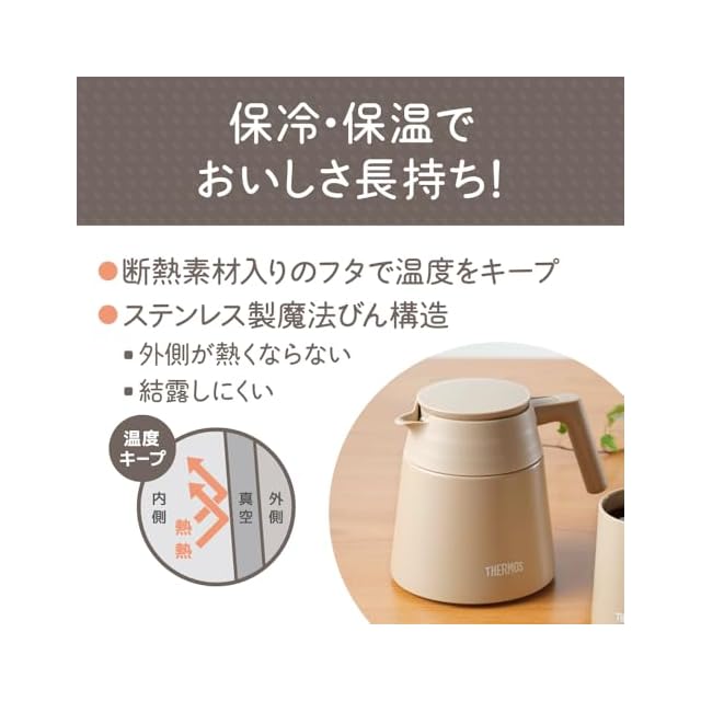 素材:内びん:ステンレス鋼(セラミック塗膜加工)/ 胴部:ステンレス鋼(アクリル樹脂塗装)/ 注ぎ口・ハンドル:ポリプロピレン / フタ: ポリプロピレン(発泡ポリプロピレン内蔵)
