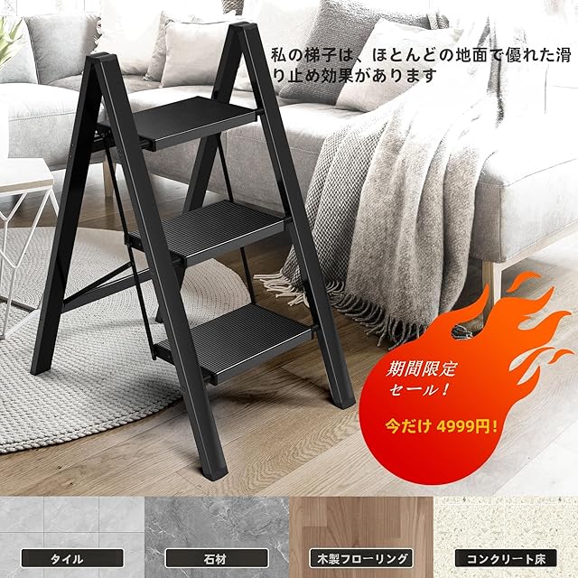 TranquilClimb 脚立 3段 アルミ製、折りたたみ式、スタイリッシュで軽量、収納スペースが少ない ステップスツール 最大150キログラムの耐荷重 滑り止め付き 広いアルミ製ステップ 屋内外で使用可能(黒色、3段階)