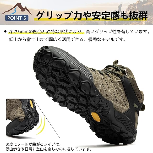 優れたグリップ力で快適な歩行をサポート 滑りやすい岩場やぬかるんだ山道でも、しっかりと地面を捉えるグリップ力を発揮する登山靴。どんな地面でもしっかり踏みしめ、快適に歩行できます。登山やハイキング、キャンプなどのアウトドア活動に最適で、長時間の歩行でも快適さを維持します。