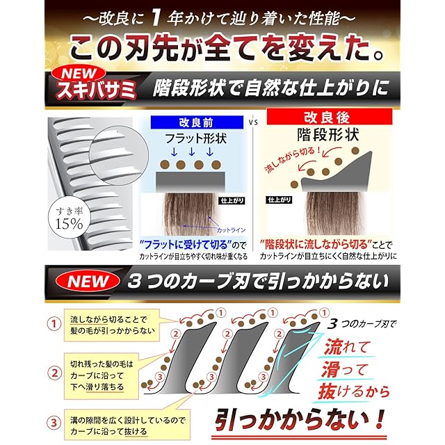 【商品仕様】一般的なすきバサミはすき率25%以上ですが、こちらはすき率15%。すき率を抑える事によって、“すきすぎる”ことなく初心者の方でも失敗するリスクを抑え、とても快適に自然に仕上げることができます。