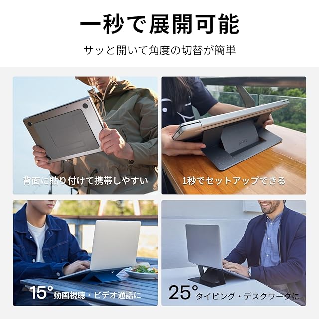 【世界初・即刻開き】2019年にアメリカKickstarterで初デビューし、数百万ドルを調達したスター製品——世界最薄クラスのノートPCスタンド「 MOFT(モフト)」 オリジナル折りたたみ式デザインにより、一瞬で開いて使用できます。デビューして三年間、世界中100万人以上のユーザーに愛用され、人々のデジタルライフにサポートし続けました。