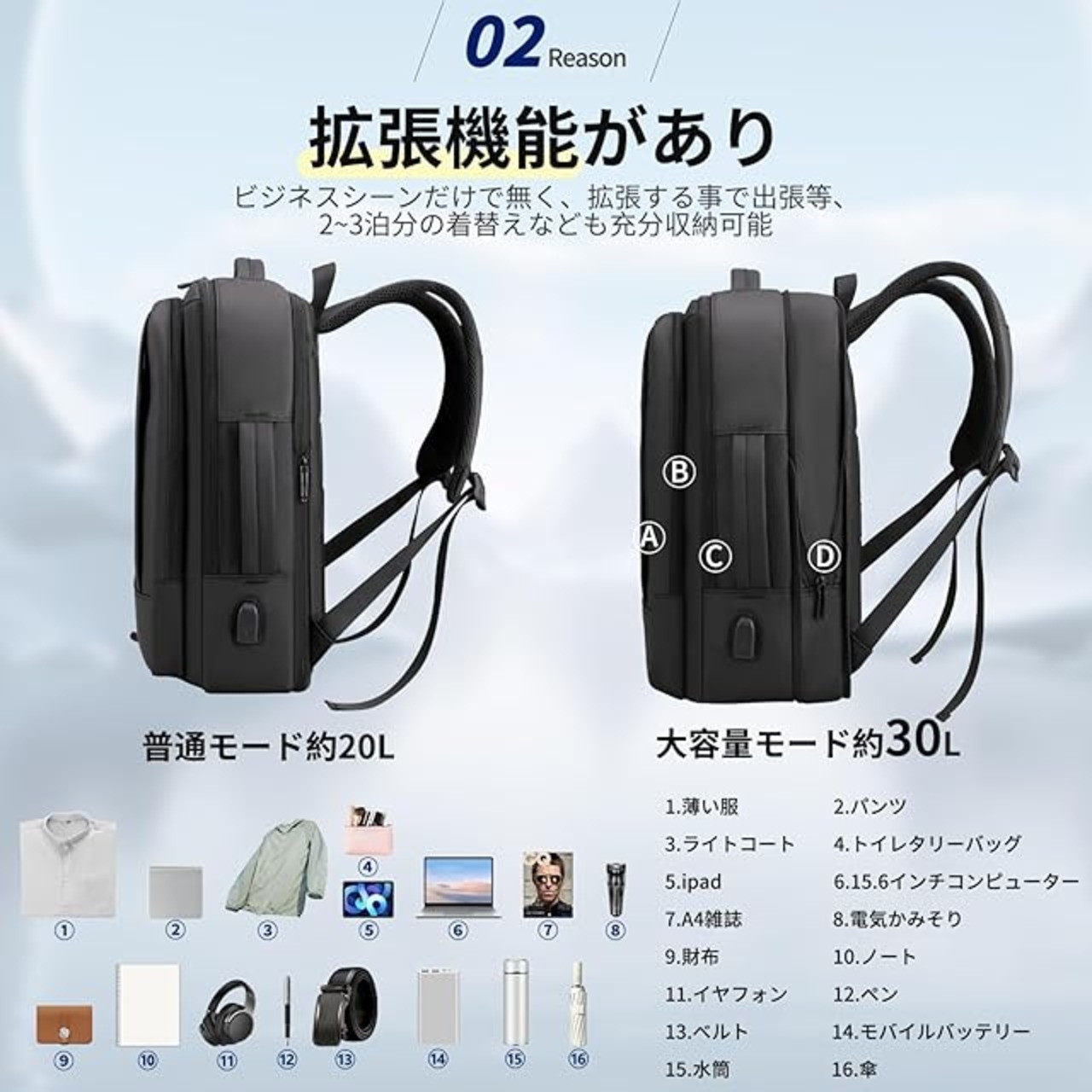 【マチ拡張&大容量収納】サイズ:45×34×12cm(拡張前:約20L)/45×34×20cm(拡張後:約30L)ポケットの数:11個(外側1/内側10)。リュックサックの1つの前置外ポケットは、いつでも取り出したい小物を簡単に収納できます。独立したパソコンポケットがあり、15.6インチのノートパソコンと 11インチのiPadを完全に収納できます。また、パソコンポケットのインナークッションは防震緩衝材とマジックシールの閉鎖方式を採用し、重要なパソコンとタブレットを保護することができます。マチ拡張前、リュックの厚みはわずか12cmなので取り回しやすく、日常の通勤にぴったりでした。拡張後、合計約30Lの貯蔵スペースと分倉設計は、1泊2日の出張に必要なすべてのものを収容できます。通勤、出張、通学、旅行など様々な場合に合わせて利用できます。