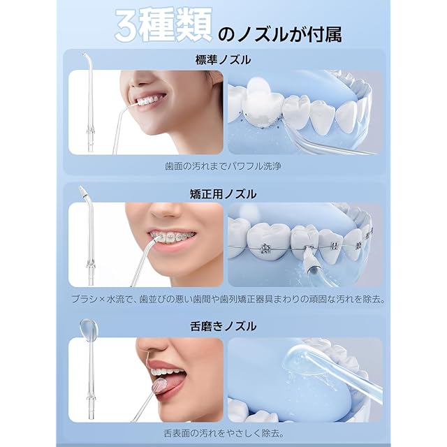 「豊富な付属ノズルも魅力」この口腔洗浄器は、通常のノズルに加えて舌用や矯正用があり、それぞれ使い分けると口内全体をしっかりときれいにできます。とくに矯正中の人は矯正用ノズルが付属している口腔洗浄器を選ぶと、より快適に口内の汚れをとれますよ。矯正中でワイヤーに食べカスなどの汚れが溜まりやすい人におすすめです。用途に合わせて使い分けできますよ。