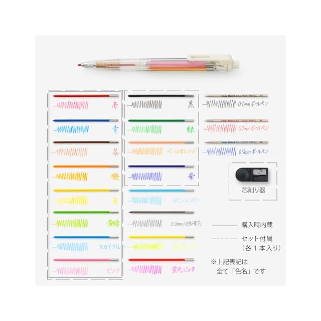【本体サイズ】W17×D13×H140mm/16g 【材質】軸=PC クリップ=ABS 先金・チャック=真鍮 頭冠=PP 替芯ケース=AS キャップ=PE 削り器=ABS